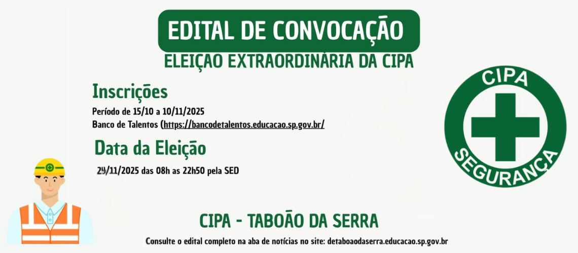 ❮ ❯ Processo Seletivo para Preenchimento da Função COE (antigo Vice-Diretor) e Formação de Cadastro de Reserva. … Leia mais »EDITAL DE PROCESSO SELETIVO PARA DESIGNAÇÃO DIRETOR ESCOLAR – 07 / 2025 … Leia mais »CLASSIFICAÇÃO FINAL DO CREDENCIAMENTO EMERGENCIAL – OUTUBRO DE 2025 … Leia mais »EDITAL DE CADASTRAMENTO EMERGENCIAL E CREDENCIAMENTO EMERGENCIAL PEI – 2º SEMESTRE DE 2025 … Leia mais »VAGAS REMANESCENTE DO PROGRAMA ENSINO INTEGRAL – 10 DE OUTUBRO DE 2025 … Leia mais »EDITAL – CONVOCAÇÃO DE ESCOLHA DE VAGAS PARA AGENTE DE ORGANIZAÇÃO ESCOLAR 2025 … Leia mais »COMUNICADO Nº 609 /2025 – PROCESSO SELETIVO POC – 2025 … Leia mais »EDITAL DE PROCESSO SELETIVO PARA DESIGNAÇÃO DIRETOR ESCOLAR – 06 / 2025 … Leia mais »EDITAL DE CONVOCAÇÃO PARA INSCRIÇÃO DE CANDIDATOS À ELEIÇÃO EXTRAORDINÁRIA DA CIPA … Leia mais »PROCESSO SELETIVO SIMPLIFICADO PARA ATUAÇÃO NO PROJETO DE APOIO À TECNOLOGIA DA INFORMAÇÃO – PROATI – 2025 … Leia mais »EDITAL DE PROCESSO SELETIVO PARA DESIGNAÇÃO DIRETOR ESCOLAR – EE NEUSA DEMÉTRIO PROFª / EE ZEICY APPARECIDA NOGUEIRA BAPTISTA PROFª – 05 / 2025 … Leia mais »TORNA SEM EFEITO o Edital de Convocação para Sessão de Escolha de Vaga, publicado em Diário Oficial de01/09/2025, na parte em que convocou no dia 12/09/2025, os candidatos aprovados na … … Leia mais »RETIFICAÇÃO – EDITAL DA 6ª ALOCAÇÃO PROGRAMA ENSINO INTEGRAL – VAGAS REMANESCENTES … Leia mais »Edital de Divulgação da Classificação do Cadastro Emergencial – Edital de 21/08/2025 … Leia mais »CONVOCAÇÃO PARA ENTREVISTAS – 3º CADASTRAMENTO EMERGENCIAL E CREDENCIAMENTO EMERGENCIAL – PARA ATUAÇÃO EM 2025 … Leia mais » Portal do Servidor Escolas dos municípios de Taboão da Serra e Embu das Artes Secretaria Escolar Digital Aplicativo para alunos e responsáveis Informações e indicadores educacionais Site para abertura de ocorrências Educação mediada por Tecnologia Plataforma para Gestão Digital de Documentos e Processos Plataforma para Abertura de Ocorrências da Secretaria Atestados e Certificados Informes anteriores…