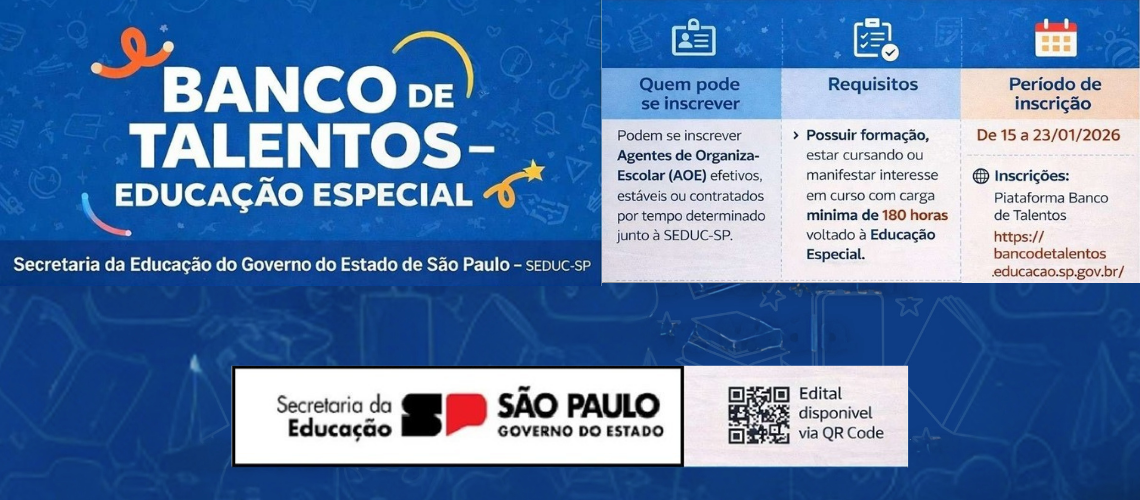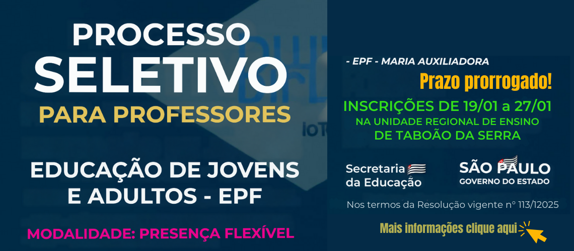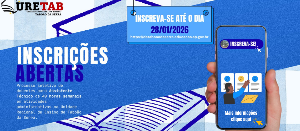 ❮ ❯ EDITAL DE CONVOCAÇÃO PARA SESSÃO DE ATRIBUIÇÃO 2026 – DOCENTES PARA ATUAÇÃO EM ATENDIMENTO À AÇÃO JUDICIAL E INTÉRPRETE DE LIBRAS … Leia mais »7º EDITAL DE CONVOCAÇÃO ENTREVISTA – 05 DE FEVEREIRO DE 2026 … Leia mais »Convocação dos docentes do quadro permanente [(Cat. A, Cat. (P, N, F)] … Leia mais »2º EDITAL DE CONVOCAÇÃO – 30 de janeiro de 2026 … Leia mais »EDITAL PROCESSO SELETIVO DE DOCENTES PARA EXERCÍCIO EM ASSISTÊNCIA TÉCNICA NA URE – TABOAO DA SERRA … Leia mais »EDITAL DE CONVOCAÇÃO PARA SESSÃO DE ATRIBUIÇÃO 2026 – DOCENTES PARA ATUAÇÃO EM ATENDIMENTO À AÇÃO JUDICIAL. … Leia mais »EDITAL DE CONVOCAÇÃO PARA SESSÃO DE ATRIBUIÇÃO 2026 – DOCENTES CONTRATADOS E CANDIDATOS À CONTRATAÇÃO … Leia mais »EDITAL DE CONVOCAÇÃO PARA SESSÃO DE ATRIBUIÇÃO 2026 – DOCENTES CONTRATADOS E CANDIDATOS À CONTRATAÇÃO … Leia mais »Vaga de Zeladoria da EE Professora Mirna Elisa Bonazzi … Leia mais »EDITAL DE CONVOCAÇÃO PARA SESSÃO DE ATRIBUIÇÃO 2026 – NÃO EFETIVOS (P – N – F) FASE URE … Leia mais »EDITAL DE CONVOCAÇÃO PARA SESSÃO DE ATRIBUIÇÃO 2026 – ARTIGO 22 … Leia mais »Edital de Atribuição Inicial Itinerário de Formação Técnico e Profissional – IFTP … Leia mais »VAGA PARA ZELADORIA – EE GENERAL RUBEM CARLOS LUDWIG … Leia mais »Convocação para Alocação PEI, etapas 5 e 6 a será realizada presencialmente na URETAB no dia 15/01/2026 … Leia mais »6º EDITAL DE CONVOCAÇÃO – 09 e 12 de janeiro de 2025 – convoca os candidatos para a realização de entrevistas de credenciamento para o exercício nas funções específicas do … … Leia mais » Portal do Servidor Escolas dos municípios de Taboão da Serra e Embu das Artes Secretaria Escolar Digital Aplicativo para alunos e responsáveis Informações e indicadores educacionais Site para abertura de ocorrências Educação mediada por Tecnologia Plataforma para Gestão Digital de Documentos e Processos Plataforma para Abertura de Ocorrências da Secretaria Atestados e Certificados Informes anteriores…